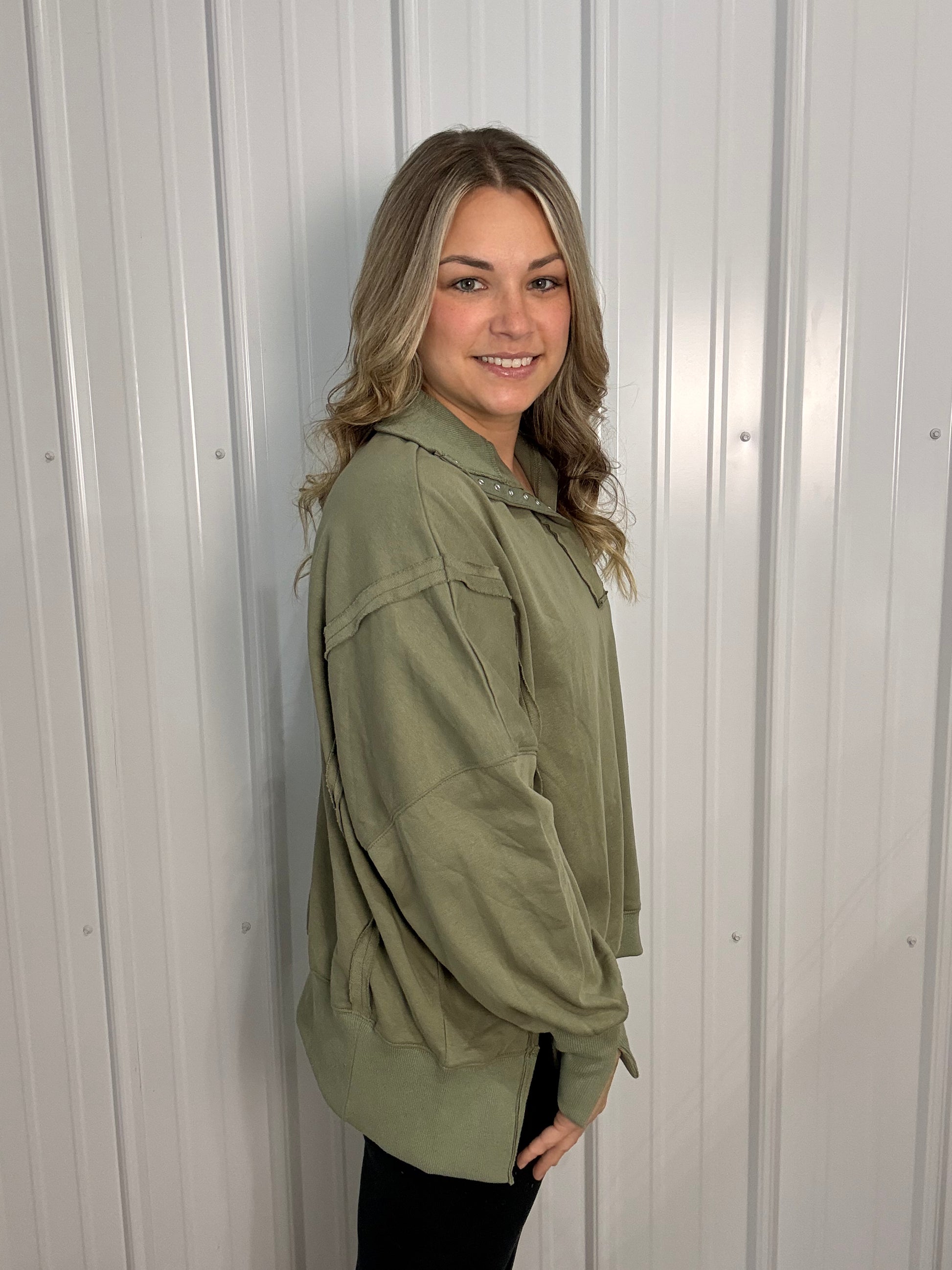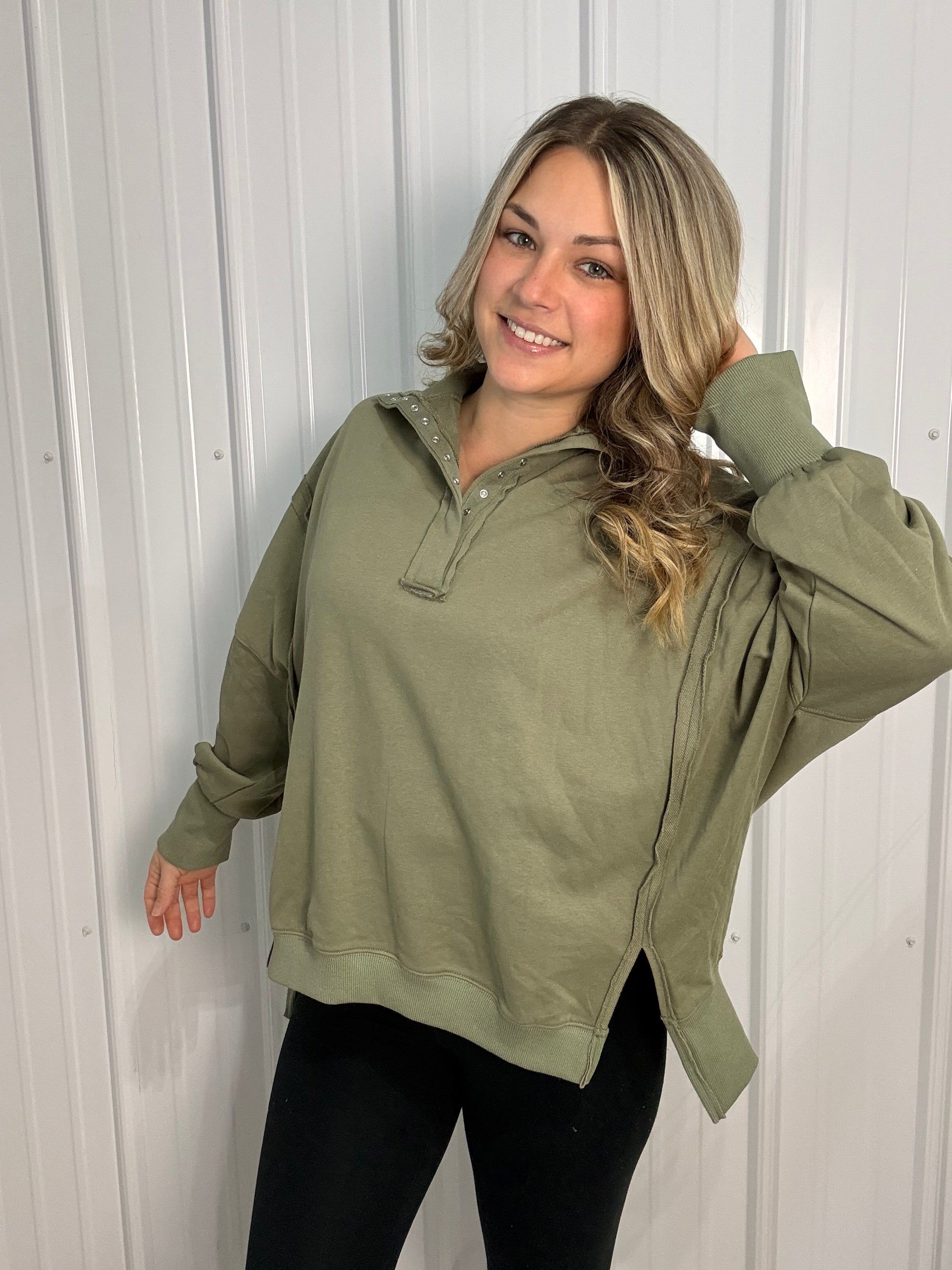 Oversized Tamika henley pullover features snap details at the neckline and a relaxed silhouette. Perfect for layering over biker shorts or leggings, it's the ultimate blend of sporty and cozy chic. Hi-low design with side slits.